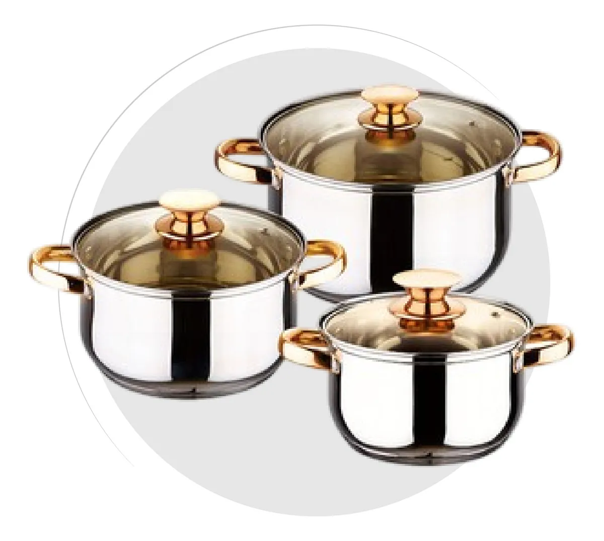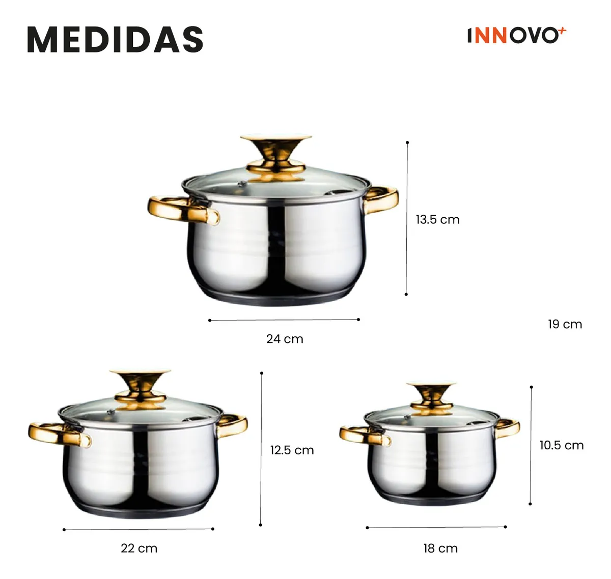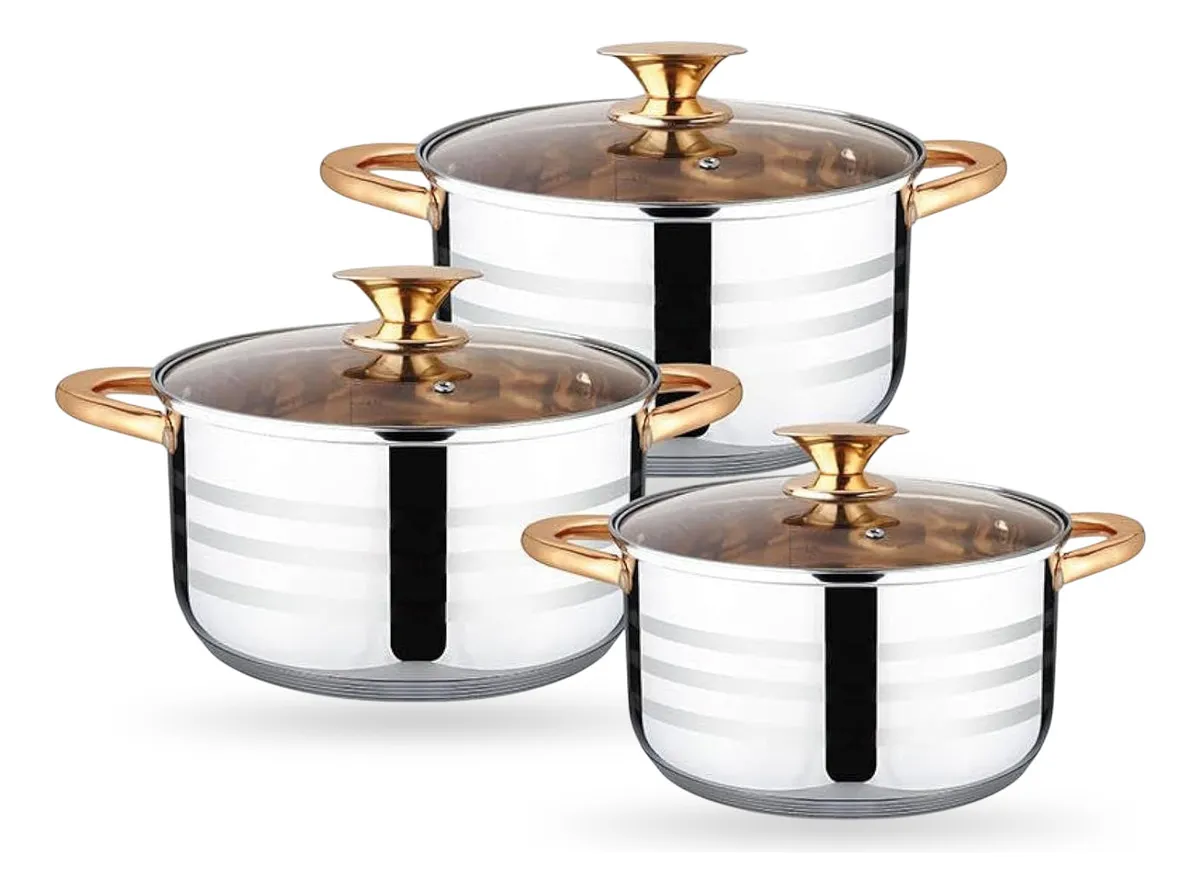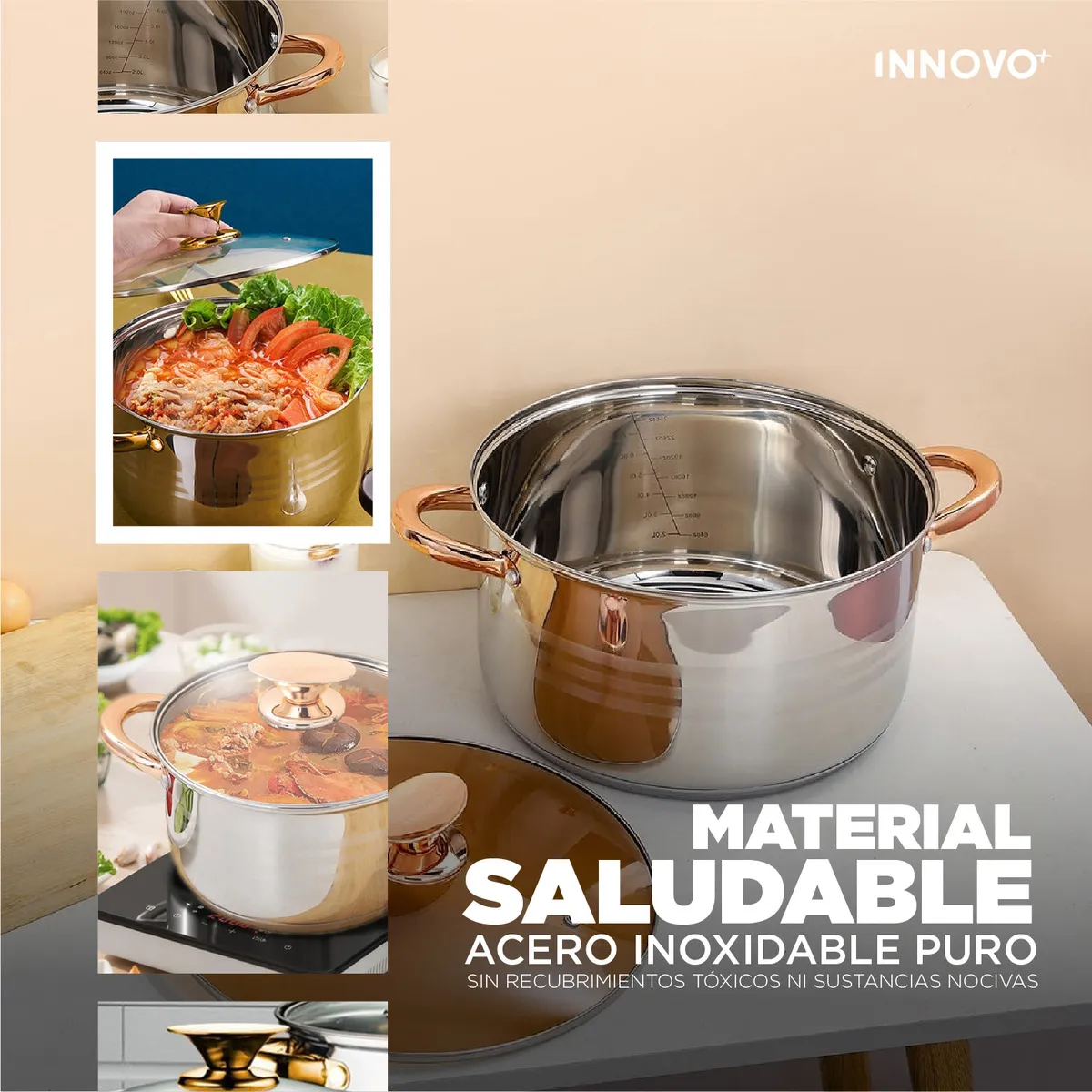 Su diseño moderno con asas metálicas doradas de lujo y tapas de vidrio templado no solo embellecen tu cocina, sino que te permiten cocinar con estilo y eficiencia.