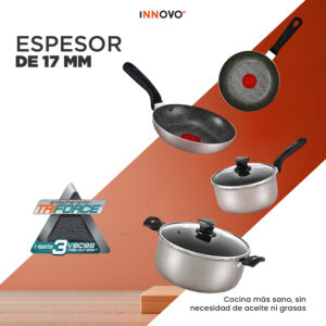 Prepara tus recetas favoritas con la batería de cocina Imusa Triforce, diseñada para durar hasta 3 veces más gracias a su recubrimiento antiadherente premium. Cocina más sano sin usar aceite y disfruta una limpieza rápida y sencilla.