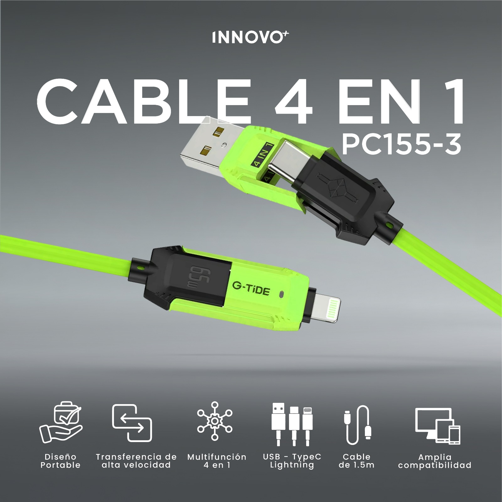 ¿Cansado de cargar con mil cables diferentes? Simplifica tu día a día con el cable G-Tide PC155-3, la solución definitiva de carga y transferencia de datos. Diseñado para ser el único cable que necesites en tu mochila, oficina o auto.