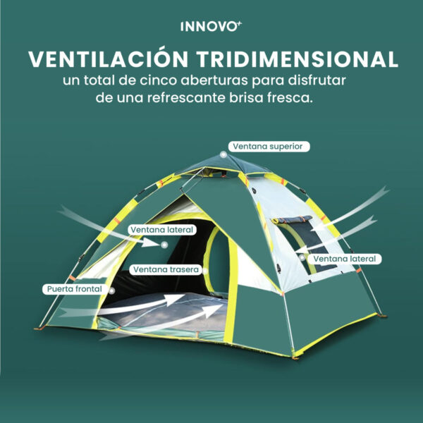 Gracias a su ventilación tridimensional, cuenta con cinco aberturas estratégicamente ubicadas (ventanas laterales, trasera, superior y puerta frontal) que garantizan una circulación de aire constante, brindando un ambiente fresco y confortable durante el día y la noche.