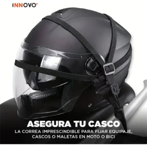 Correa ajustable: Permite adaptar la tensión y tamaño según casco, maletas, paquetes o carga.
