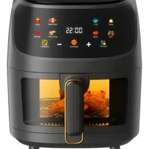 Más que una Freidora, es tu Aliado en la Cocina. Su diseño moderno en negro piano y detalles en bronce eleva la estética de cualquier cocina. Además, es tan versátil que puedes usarla para asar verduras, tostar frutos secos, deshidratar frutas o simplemente recalentar pizza y dejarla como recién hecha.