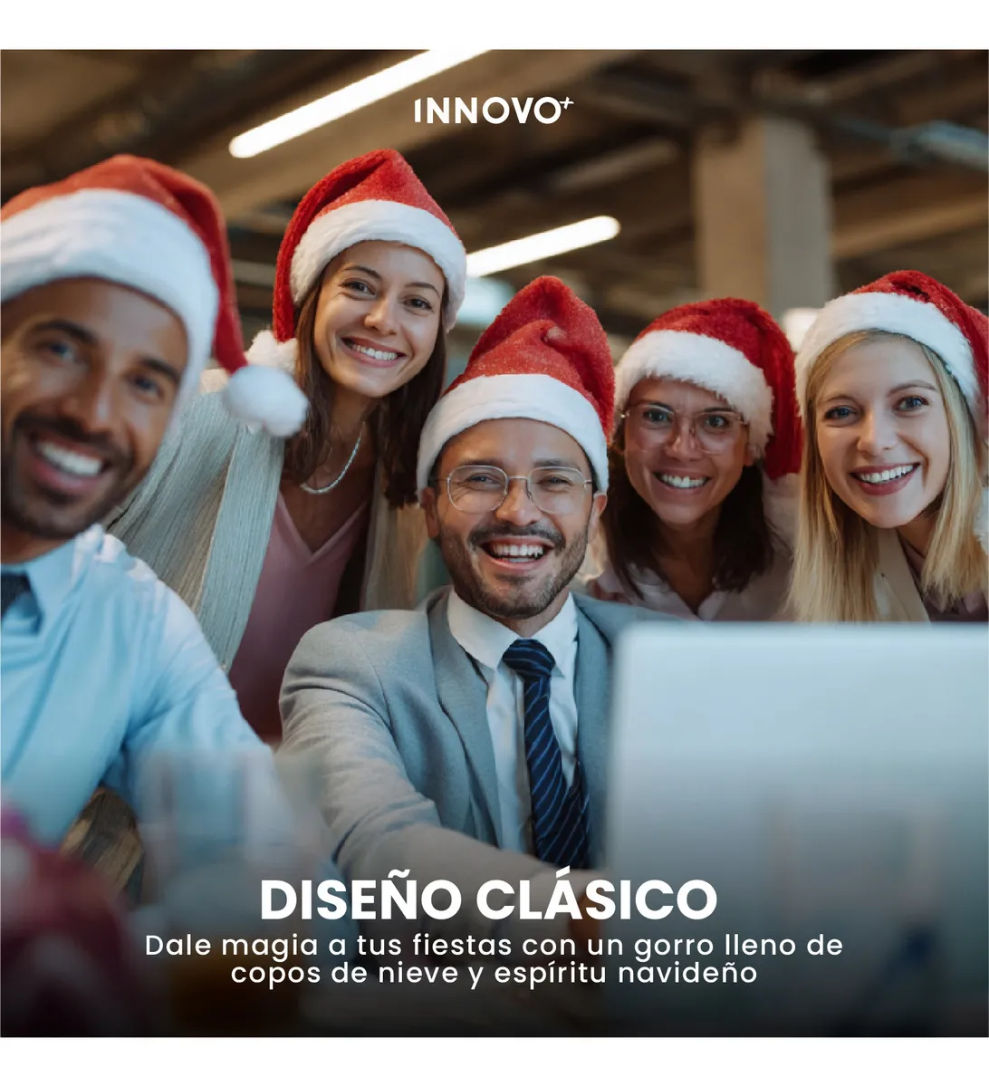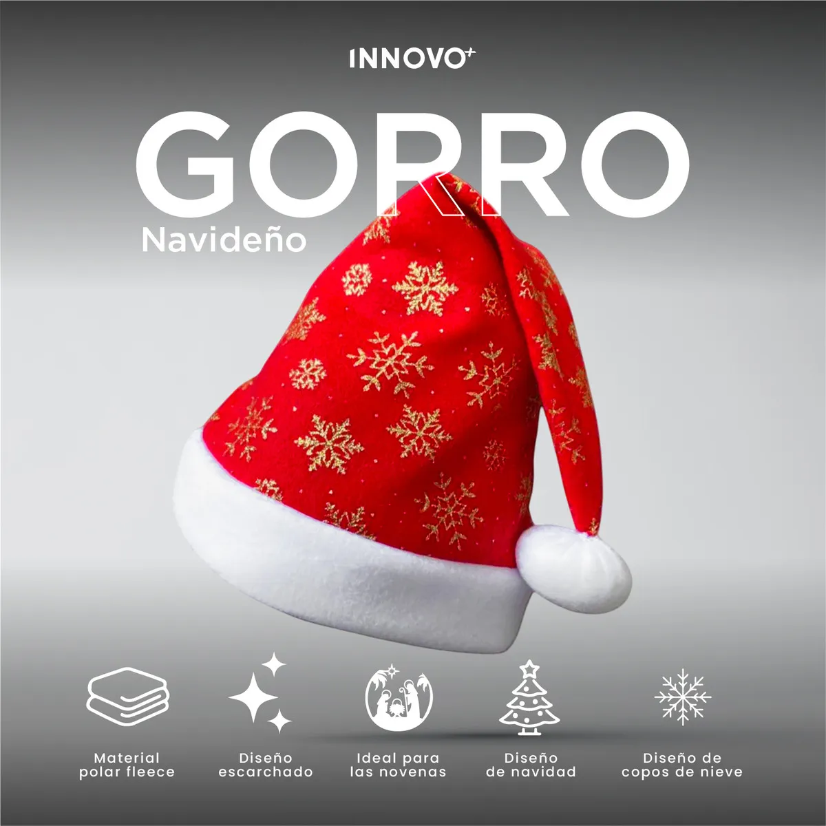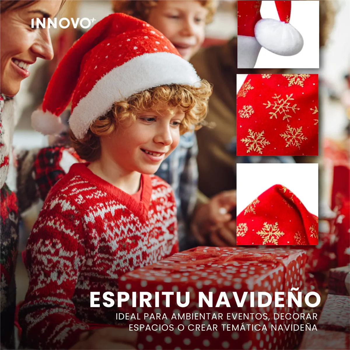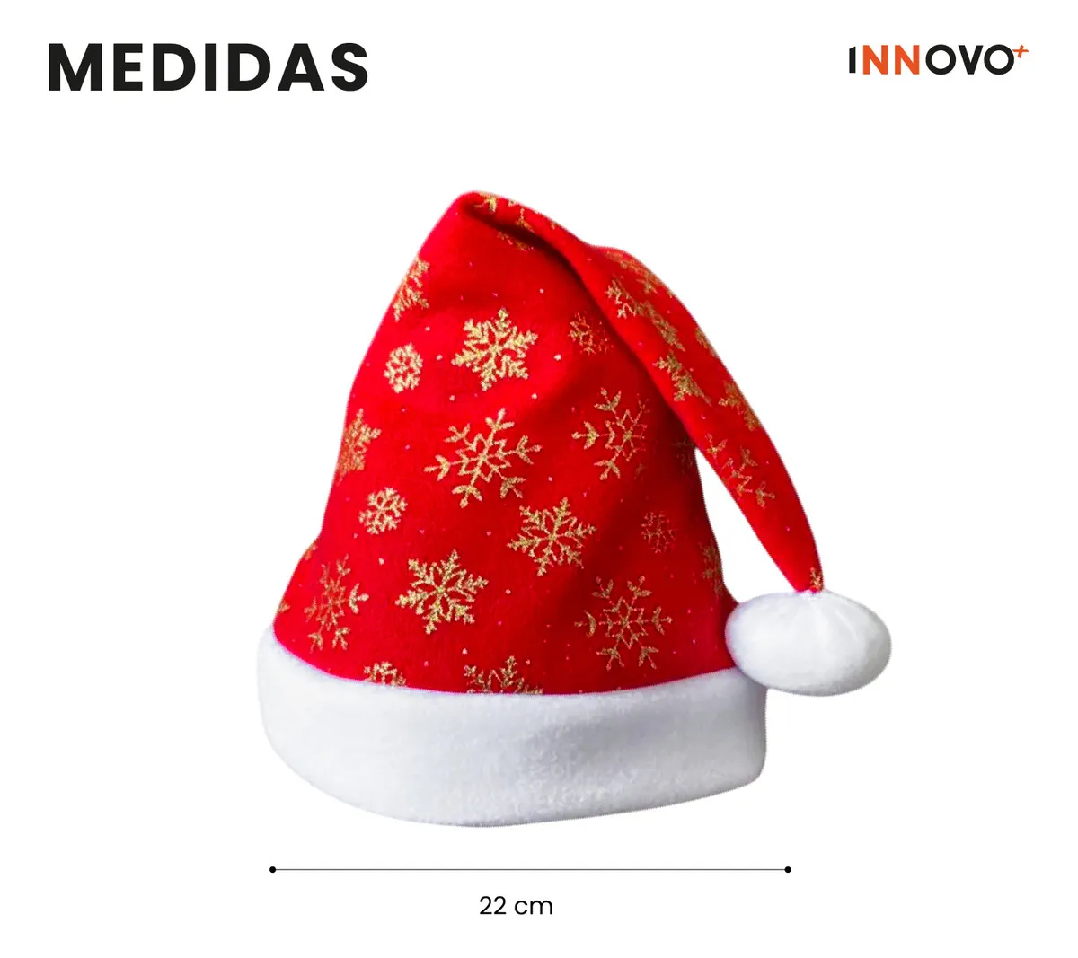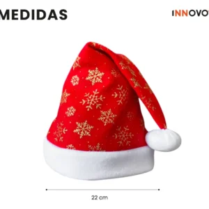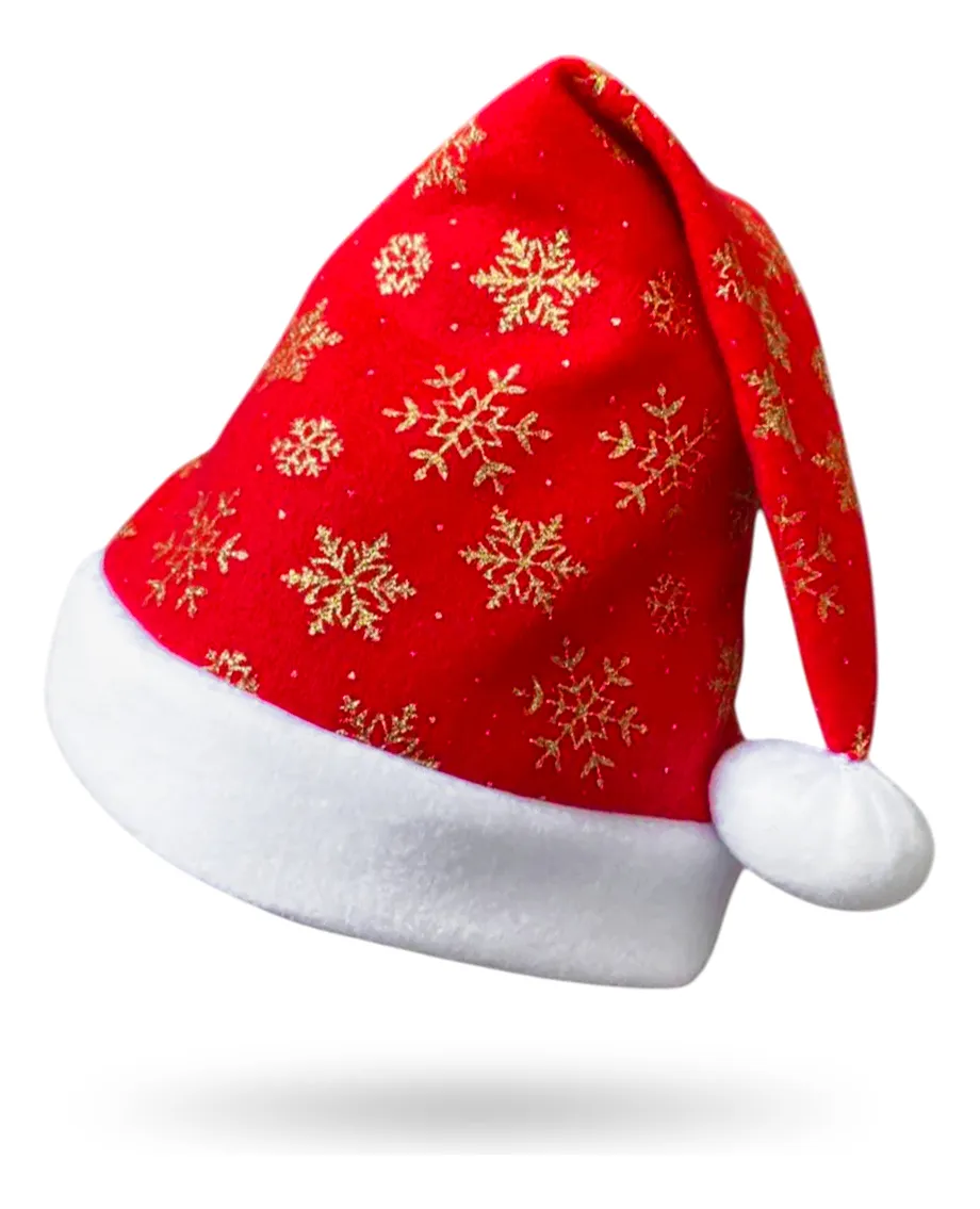 Luce el mejor espíritu navideño con este Gorro Navideño con copos dorados, ideal para darle un toque mágico a tus fiestas, fotos familiares, reuniones empresariales, novenas, eventos escolares y contenido para redes sociales.