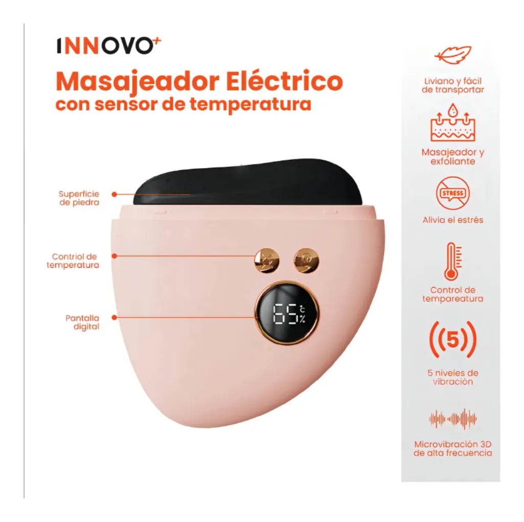 El masajeador inteligente cuenta con 5 niveles de vibración y sensor de temperatura digital, ideal para estimular la circulación, aliviar tensión muscular y mejorar la absorción de cremas y sueros. Su diseño ergonómico en forma de montaña se adapta perfectamente a las curvas del rostro, cuello y cuerpo.
