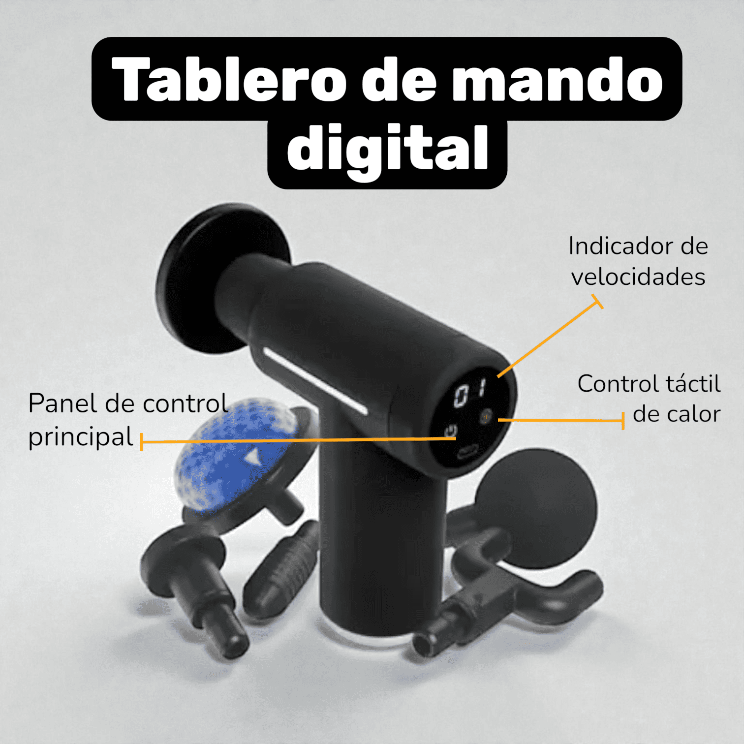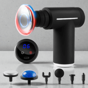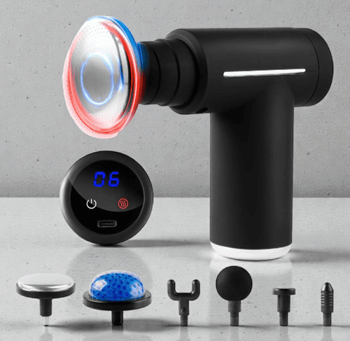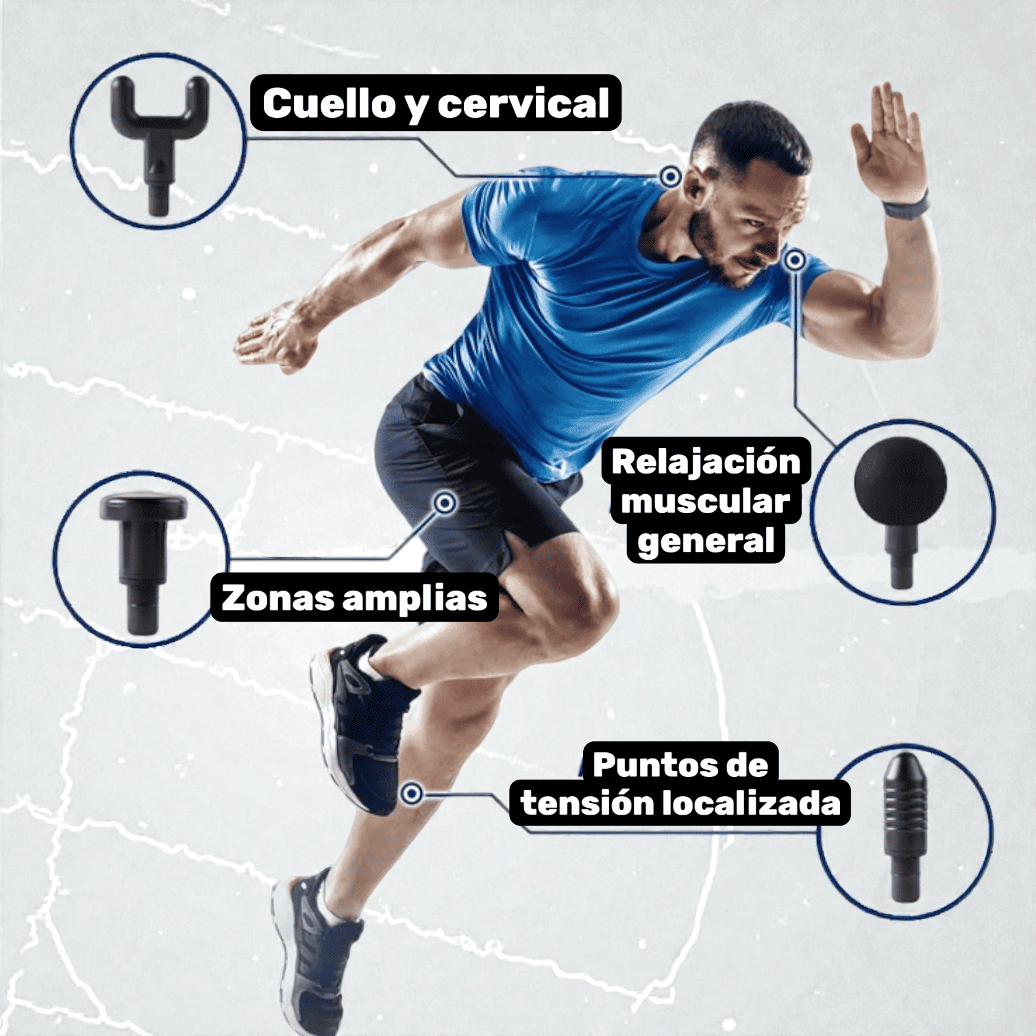 La pistola masajeadora percutora de calor o frío viene con 6 cabezas intercambiables para adaptarse a diferentes áreas del cuerpo y necesidades de masaje: