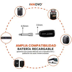 La batería de larga duración (hasta 8–10 horas) garantiza sesiones continuas sin interrupciones. Además, incluye receptor compatible con parlantes, amplificadores, buses, consolas, cabinas y equipos de sonido 3.5mm/6.35mm, lo que lo convierte en uno de los sistemas más versátiles del mercado.