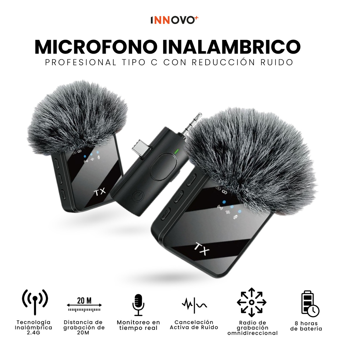Graba con calidad profesional y sin interrupciones con este micrófono inalámbrico tipo C, diseñado para creadores de contenido, transmisiones en vivo, entrevistas y grabaciones en exteriores. Con su chip DSP de reducción de ruido, captura la voz de manera clara y nítida, incluso en ambientes ruidosos.