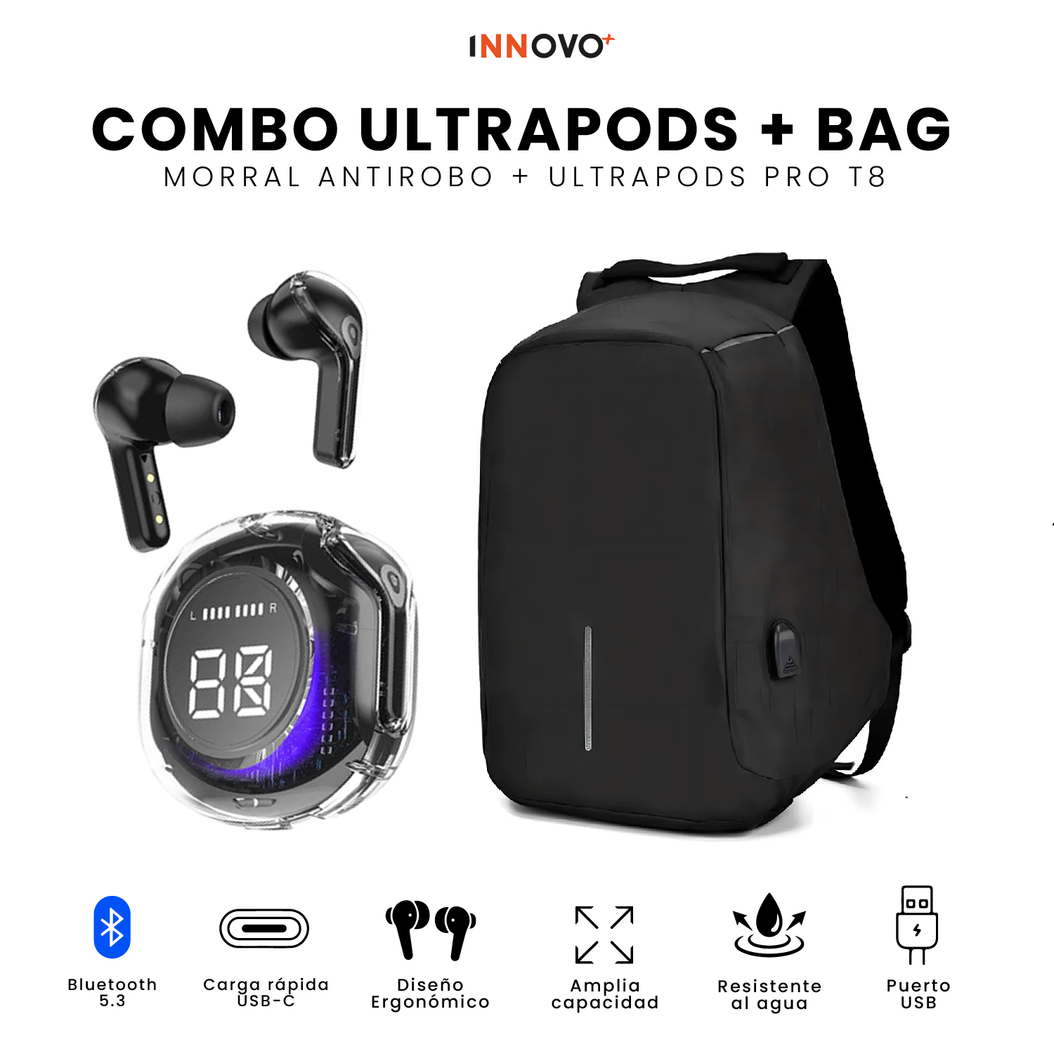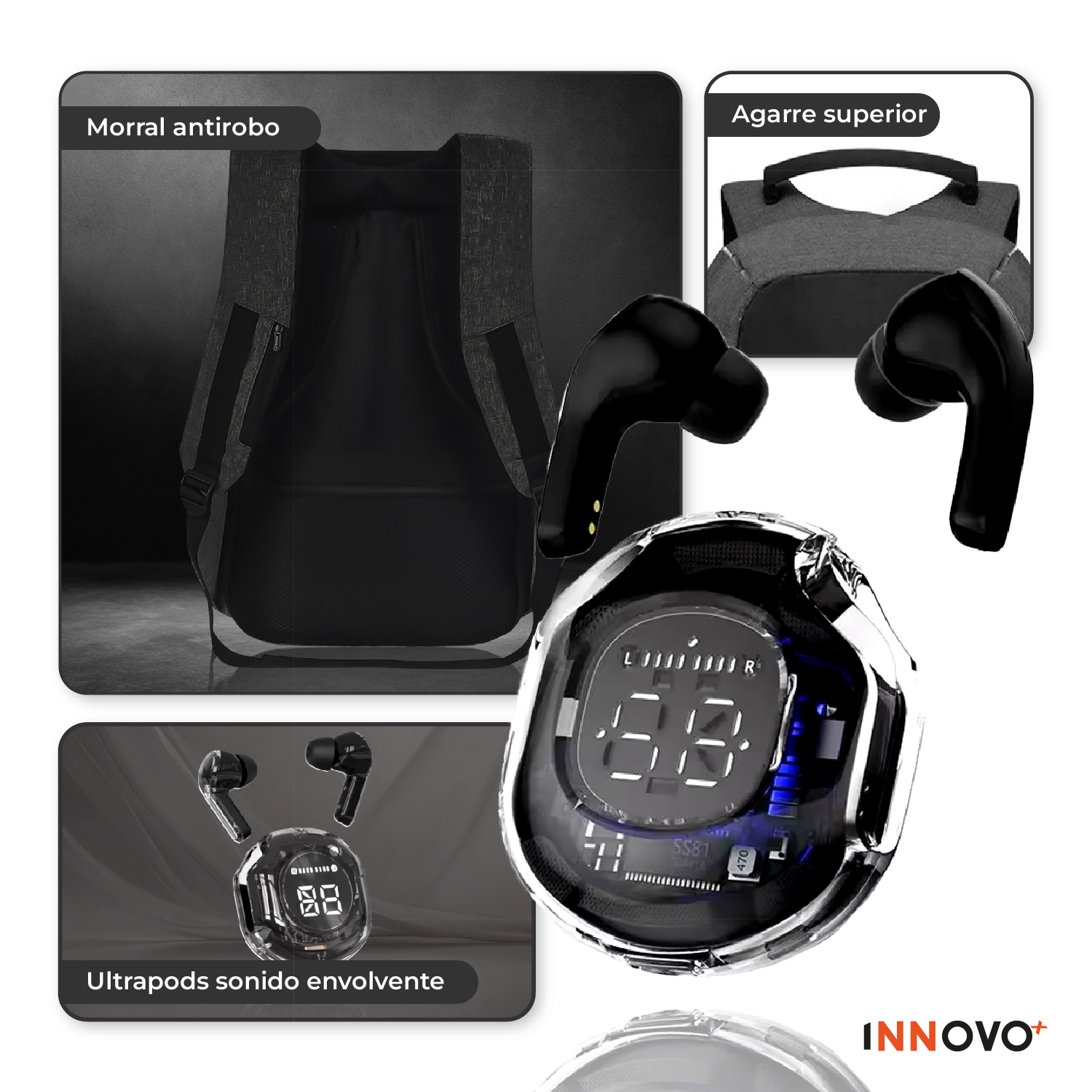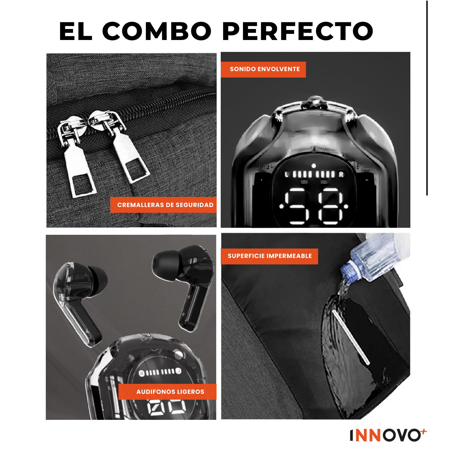 Lleva tu productividad, estilo y comodidad a otro nivel con este combo completo que incluye un morral antirrobo con compartimento para laptop y un par de audífonos Bluetooth manos libres, perfectos para mantenerte conectado mientras te mueves.