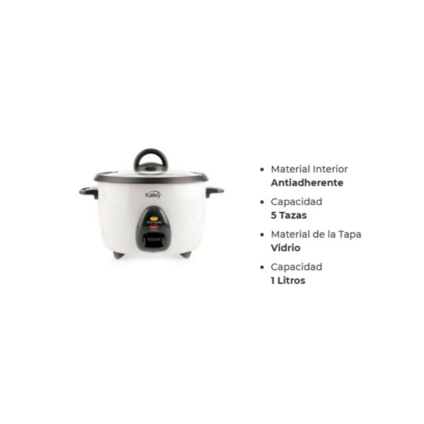 Prepara el arroz perfecto de manera rápida, práctica y sin complicaciones con la olla arrocera eléctrica Kalley de 1 litro (5 tazas). Su recubrimiento antiadherente evita que los alimentos se peguen, facilitando la limpieza y garantizando una cocción uniforme.
