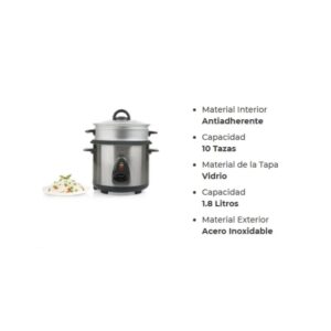Su capacidad de 10 tazas (1.8 litros) la hace perfecta para familias medianas o reuniones, y su diseño en acero inoxidable con tapa de vidrio garantiza resistencia, durabilidad y un estilo moderno para tu cocina.