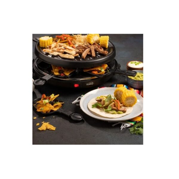 Convierte tus reuniones en experiencias únicas con la Parrilla Raclette Kalley 800W, diseñada para compartir, asar y gratinar de forma práctica y deliciosa. Con su superficie antiadherente y su sistema para 8 mini sartenes, podrás preparar carnes, vegetales, quesos derretidos, tortillas, arepas, postres y mucho más, todo al mismo tiempo.