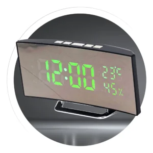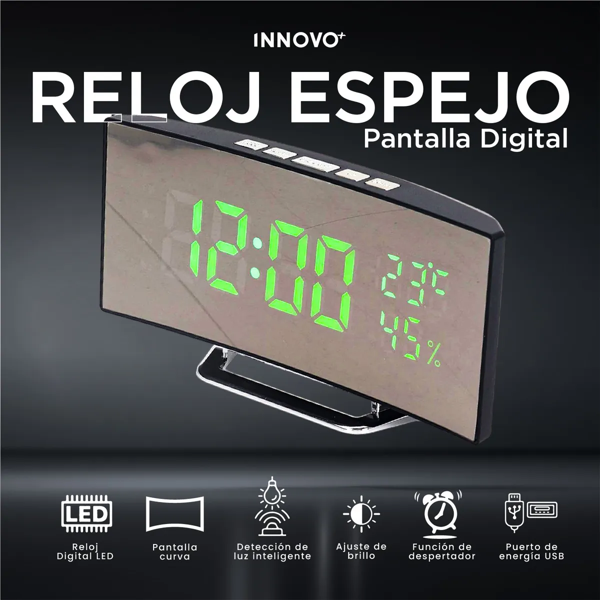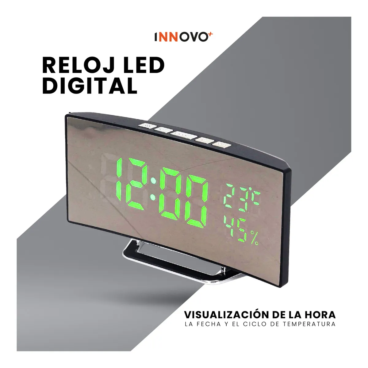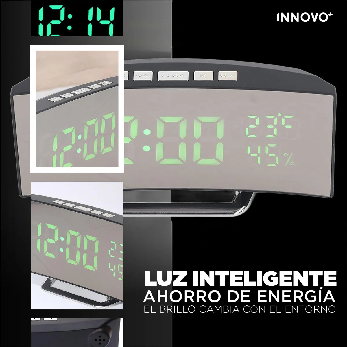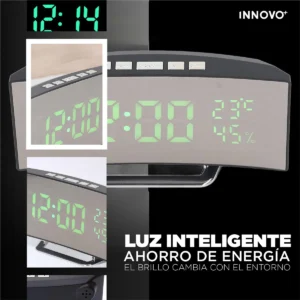 Dale un toque sofisticado a tu mesa de noche u oficina con el Reloj LED Digital Innovo+. Más que un simple reloj, es una pieza de diseño con pantalla curva tipo espejo que combina funcionalidad avanzada con un estilo minimalista único.