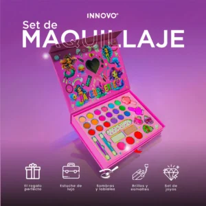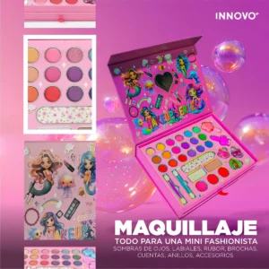 Este increíble kit incluye 40 piezas entre sombras, labiales, brillos, rubor, brochas y accesorios, organizadas en un estuche de lujo plegable con espejo, ideal para jugar, aprender y divertirse.