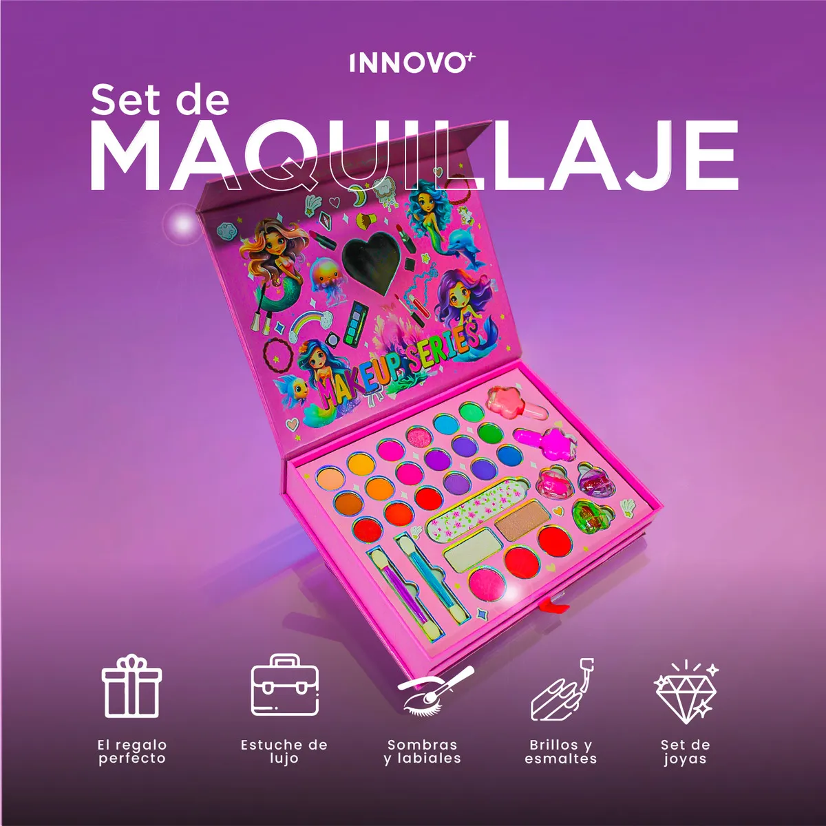 Es un juguete seguro y pensado especialmente para niñas que aman el mundo del maquillaje, la moda y la fantasía. Su diseño inspirado en sirenas y colores vibrantes convierte este kit en un elemento irresistible para niñas de todas las edades.