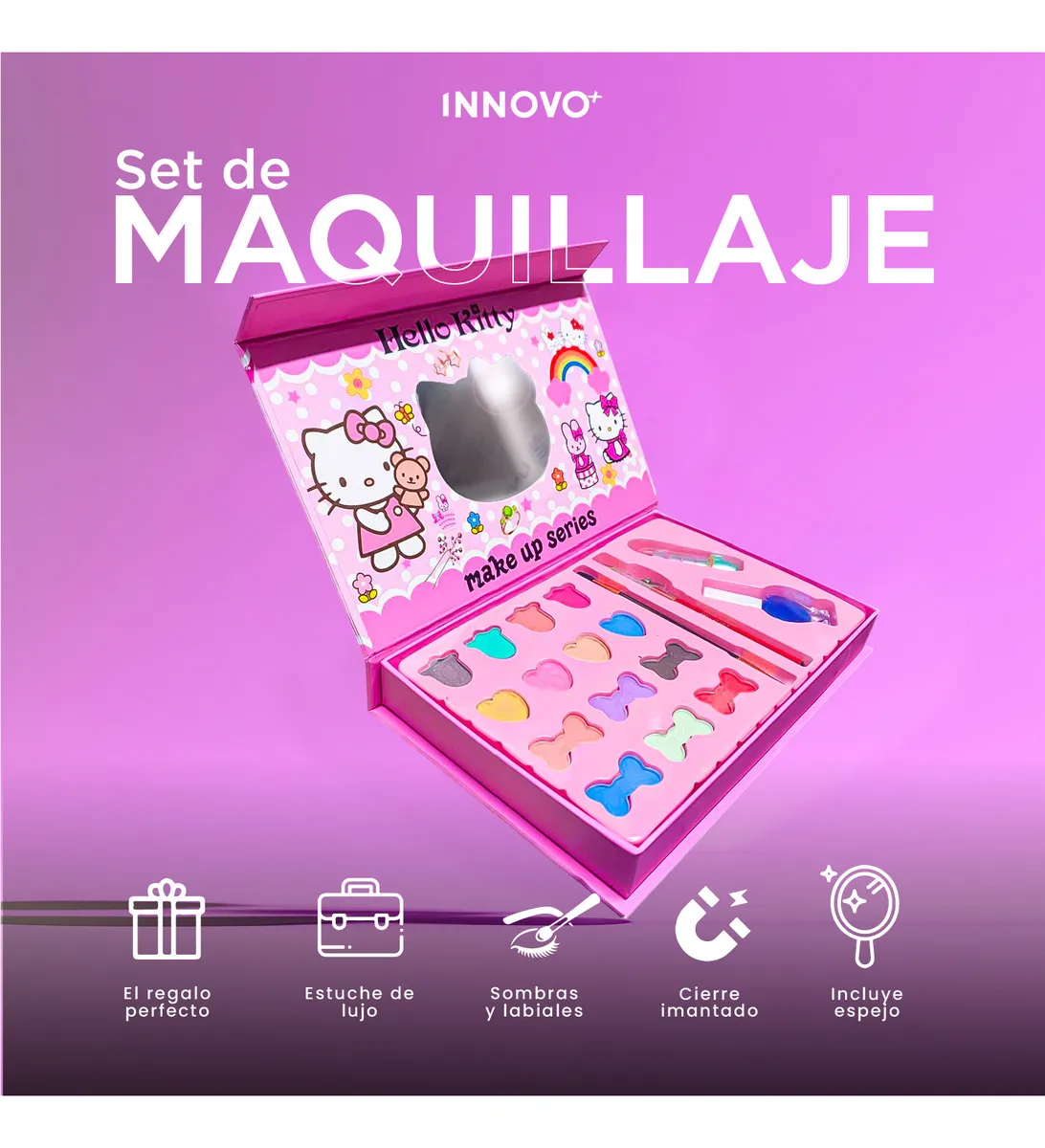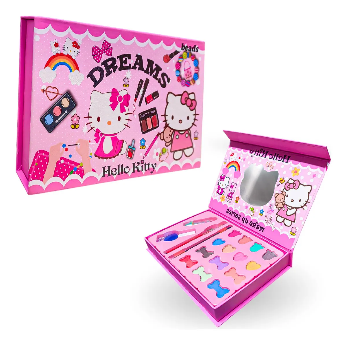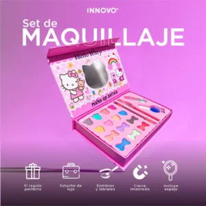 Este Set de Maquillaje Infantil Hello Kitty es el regalo ideal para estimular la creatividad, el juego imaginativo y la diversión segura. Diseñado con colores vibrantes, empaques premium y un lindo espejo en forma de Hello Kitty, este estuche hará que cada niña se sienta como toda una estrella.