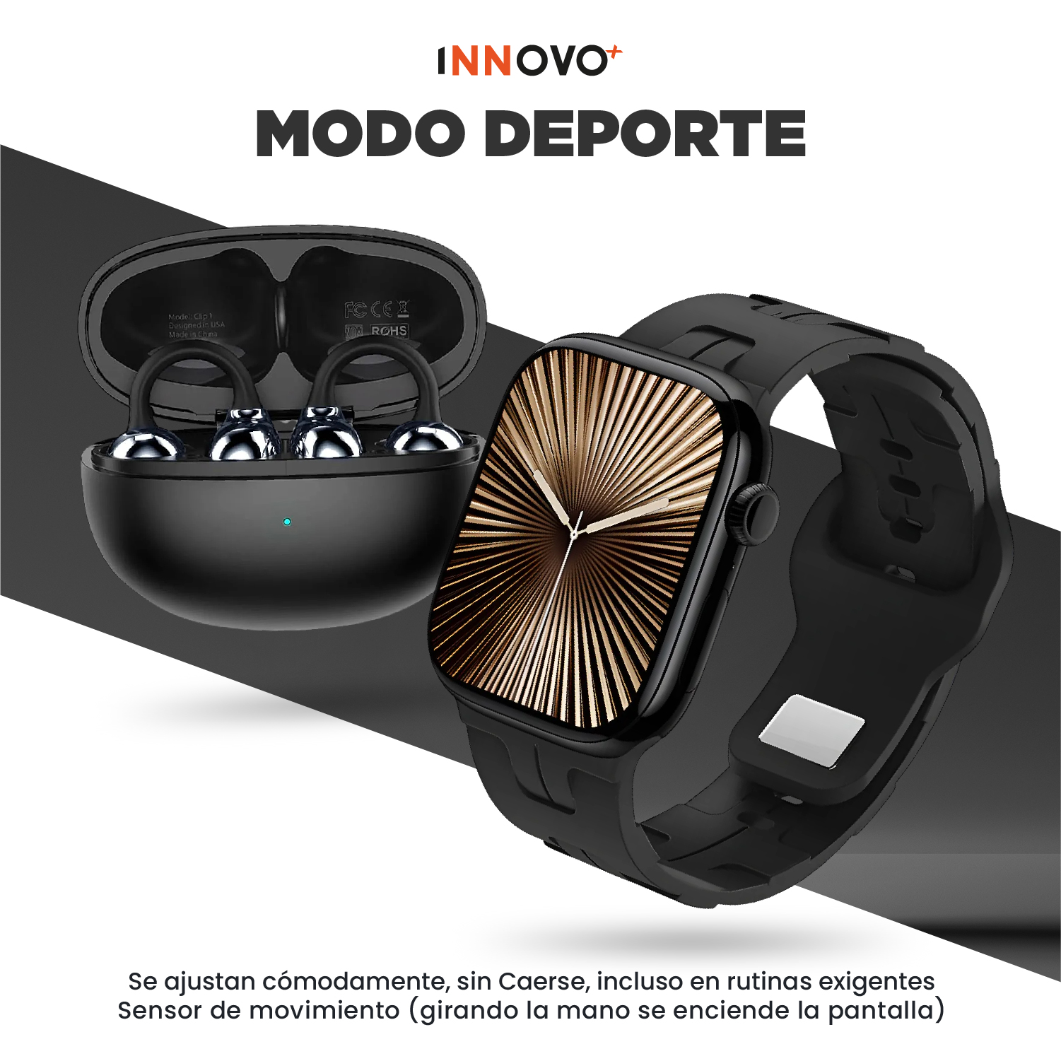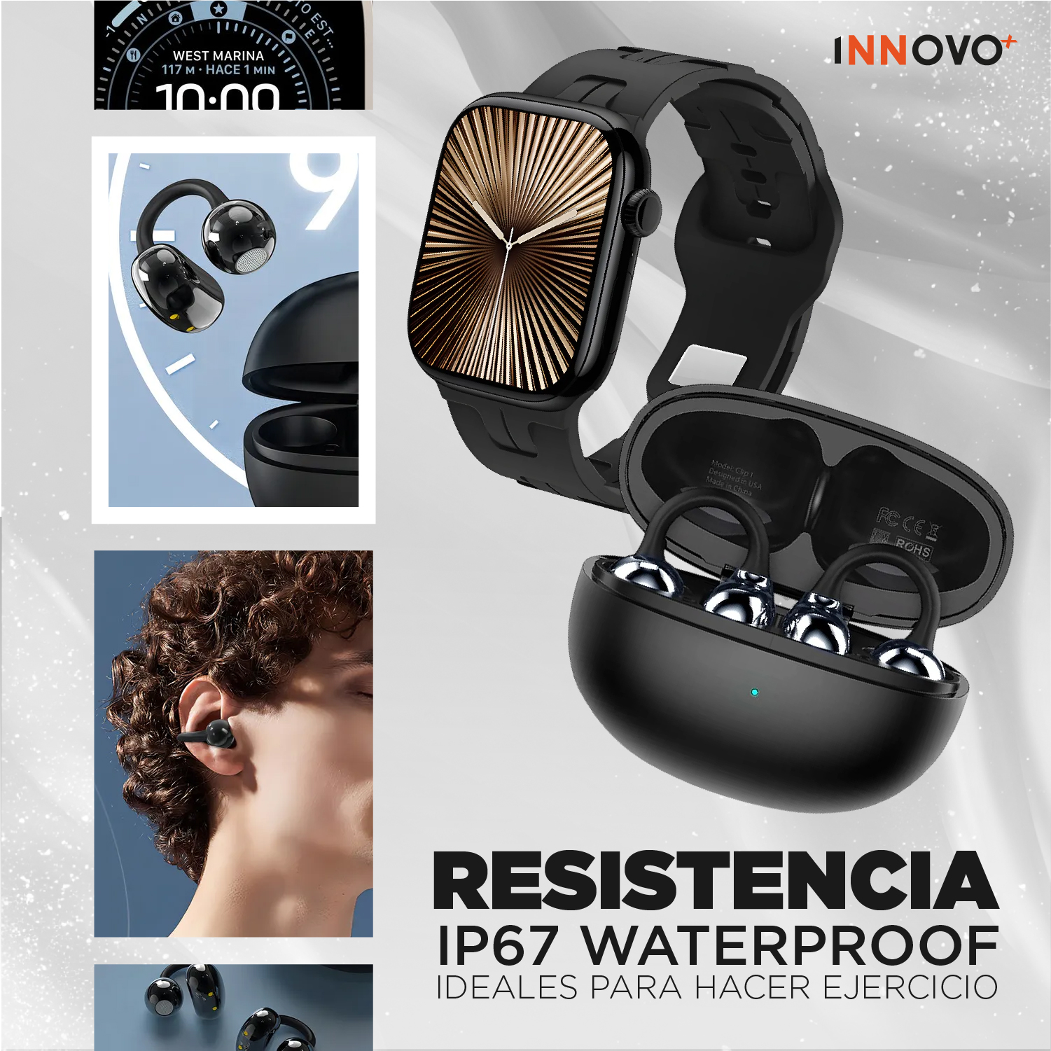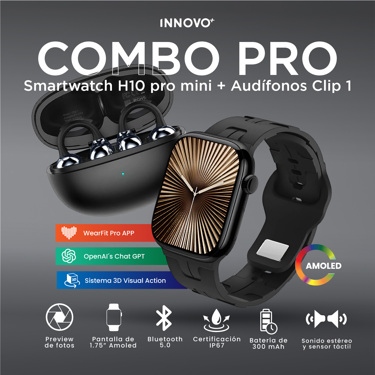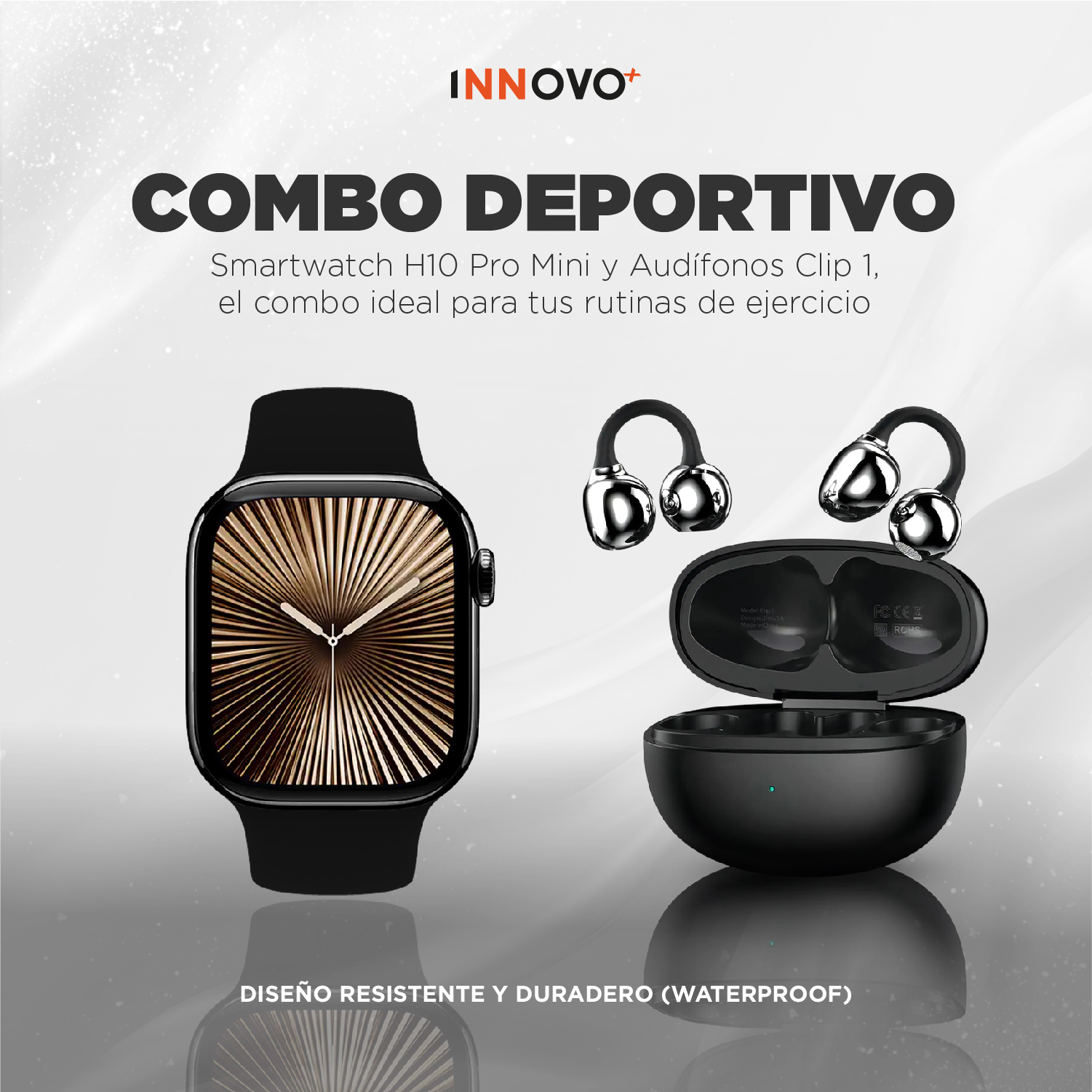 ¿Buscas la combinación perfecta entre tecnología, salud y música? El Combo Deportivo Innovo+ une el potente Smartwatch H10 Pro Mini con los revolucionarios Audífonos Clip 1, diseñados específicamente para quienes no se detienen.
