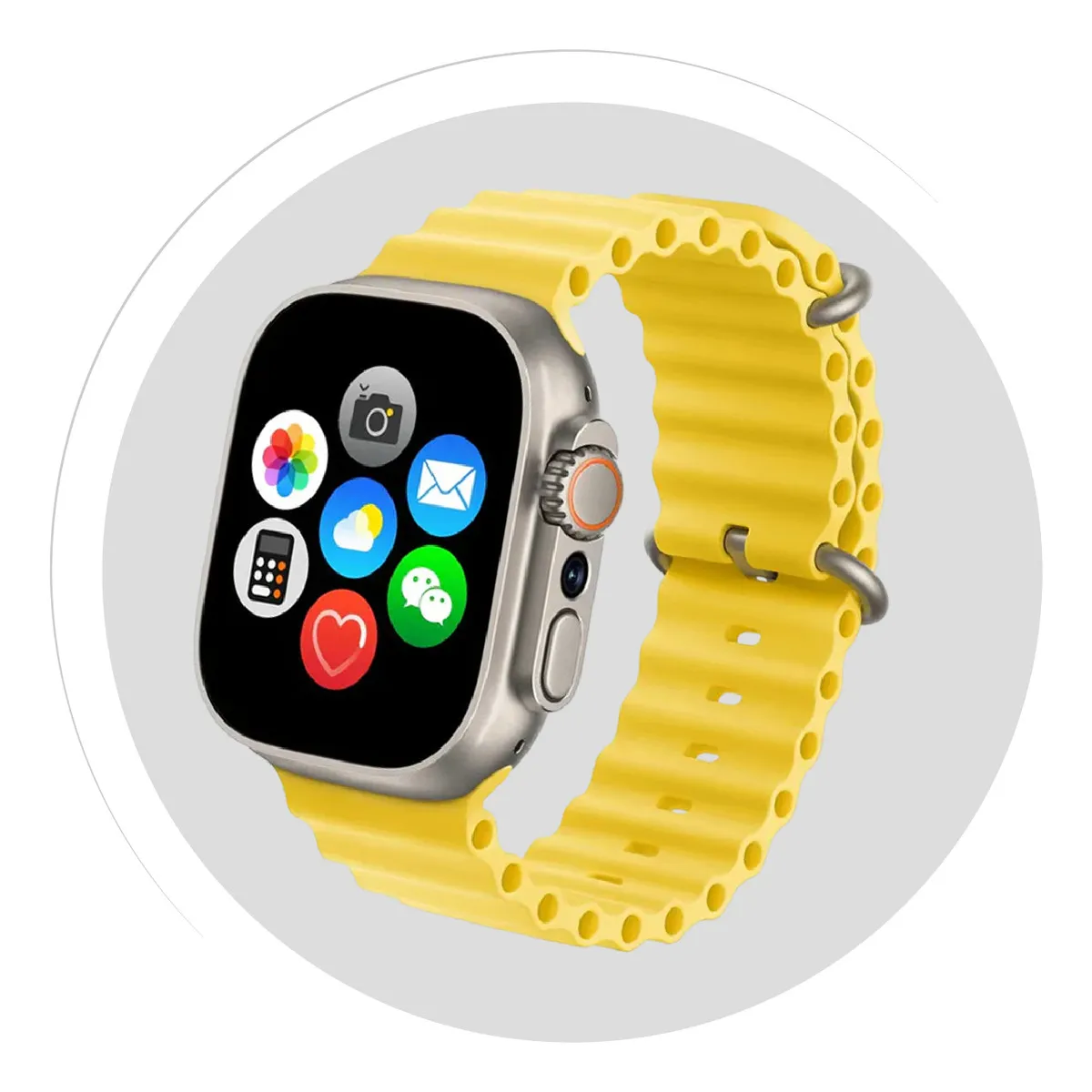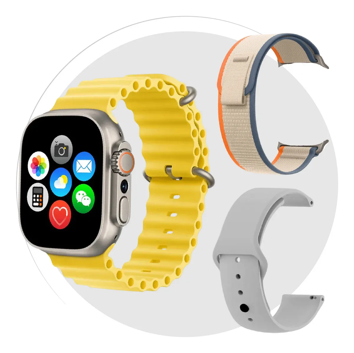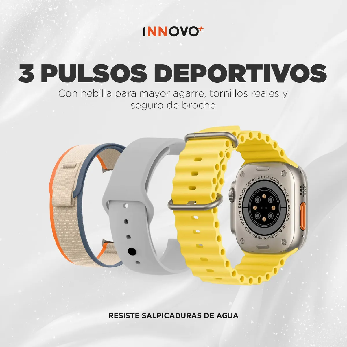 3 correas deportivas incluidas: silicona amarilla, silicona gris y correa textil premium.