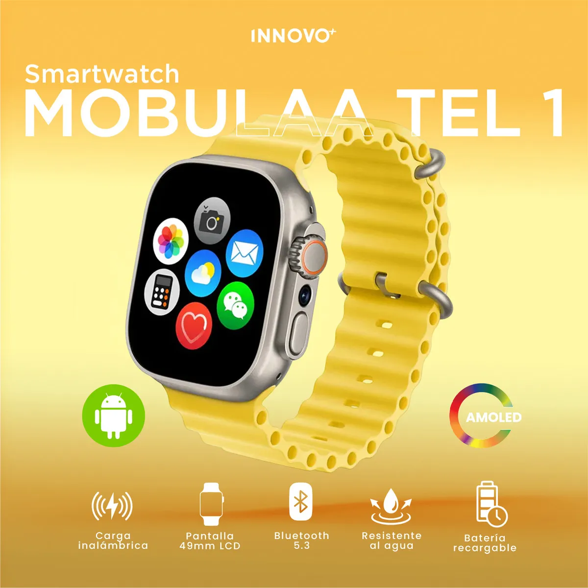 Lleva tu día al siguiente nivel con el Smartwatch MOBULAA TEL 1 Innovo+, el reloj inteligente que combina SIM Card, pantalla grande 49 mm, Bluetooth 5.3, modo deportivo, monitor de salud, carga inalámbrica, y un diseño moderno con 3 correas premium.
