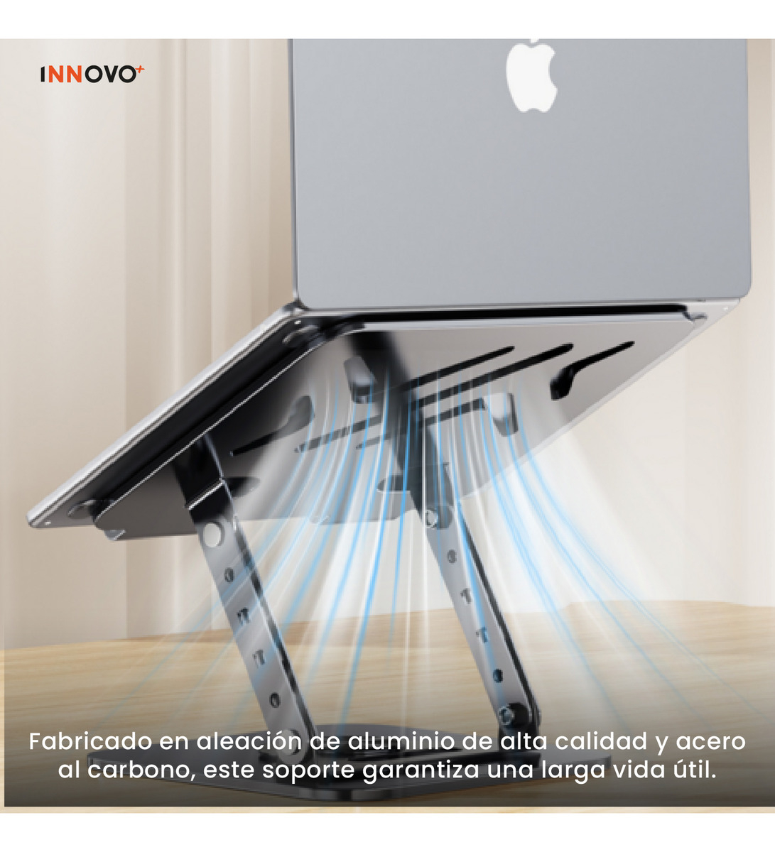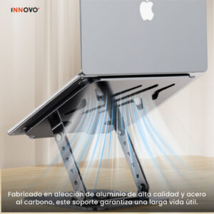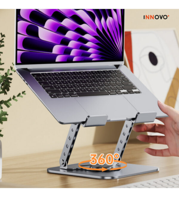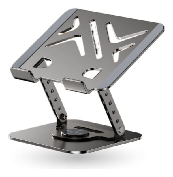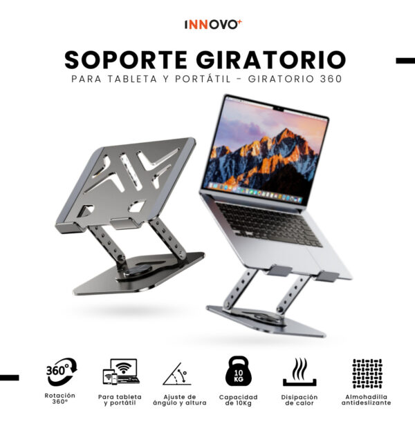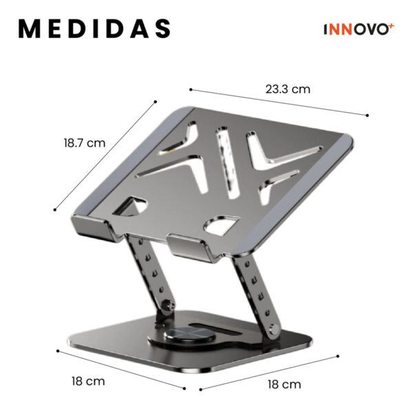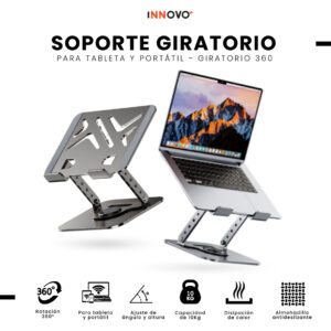 Gracias a su rotación completa de 360°, puedes cambiar fácilmente de orientación sin mover la base. Además, soporta hasta 10 kg de peso, brindando total estabilidad incluso con equipos grandes. Su diseño con ranuras de ventilación favorece la disipación del calor, cuidando la vida útil de tu dispositivo.