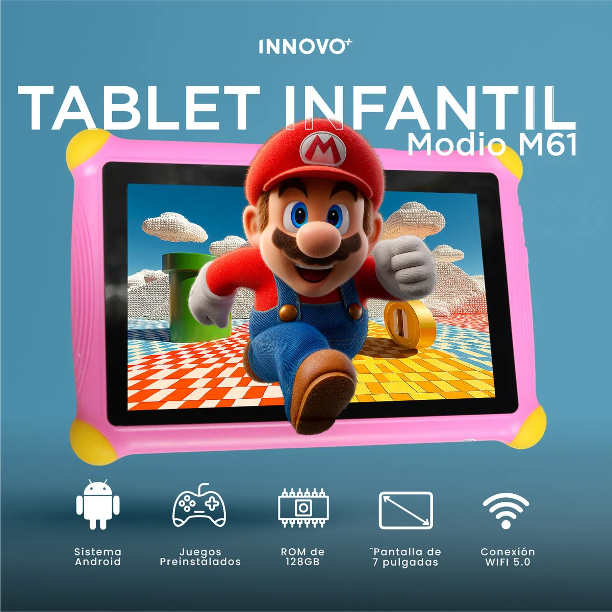 ¡La diversión, el aprendizaje y la seguridad se unen en la Tablet Infantil Super Mario Bros Modio M61 de MOBULAA! Diseñada especialmente para niños, esta tablet combina potencia, resistencia y contenido educativo, convirtiéndola en la opción ideal para regalar o acompañar a tus pequeños en su día a día.