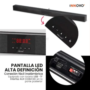 Diseño que impone: Su acabado elegante en negro piano y su pantalla LED frontal no solo ofrecen tecnología, sino que elevan la estética de tu centro de entretenimiento.