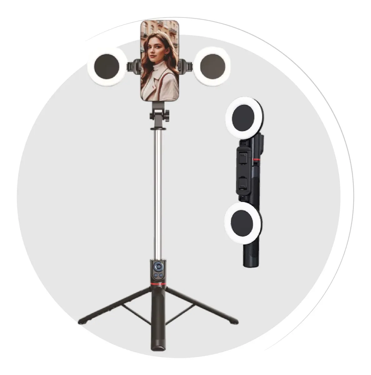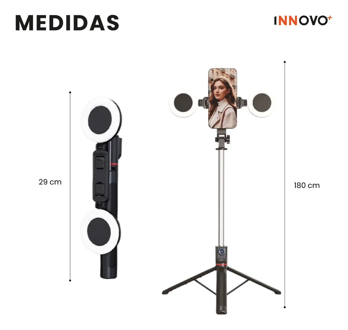 Diseño Ultra Compacto: A pesar de su enorme extensión, se pliega a solo 29 cm. Es el compañero de viaje ideal para vlogs, streaming en exteriores o eventos familiares.