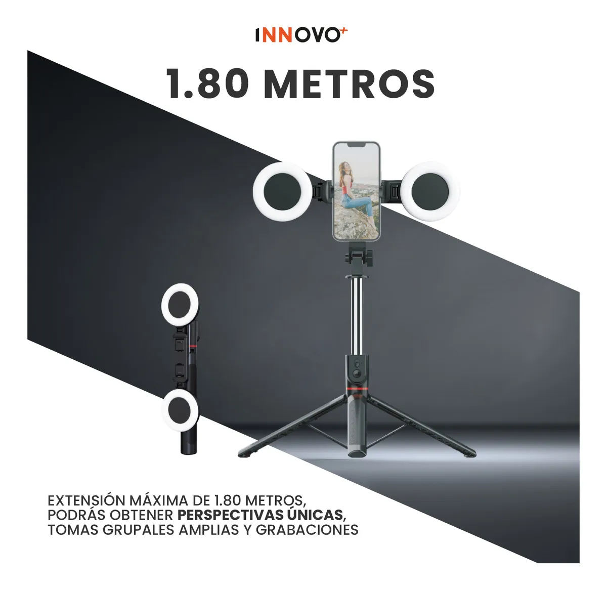 Altura de Impacto (1.80 Metros): Mientras otros se quedan a mitad de camino, nuestra extensión de 1.80m te permite capturar tomas de cuerpo completo, ángulos picados profesionales y fotos grupales épicas sin esfuerzo.